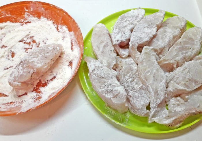 Спустя указанное количество времени обваляйте каждый кусочек рыбы в обильном количестве муки