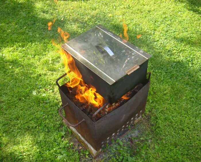 Ставим коптильню на огонь. Первое время пламя должно быть небольшим. Так опилки внутри жаровни не сгорят, а будут тлеть, выделяя неповторимый древесный аромат.