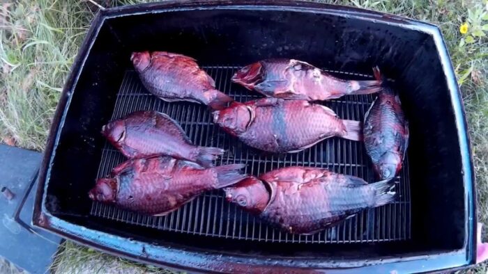 - Разогреваем жаровню и коптим рыбу до готовности.