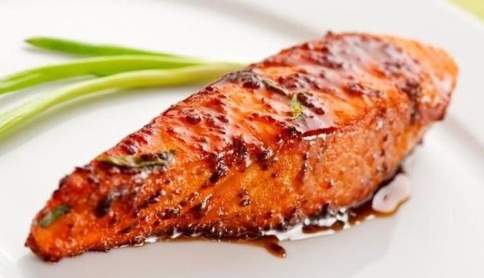 - Выложить на противень филе креветочной рыбы. Противень переложить в духовку, которую необходимо предварительно разогреть до 200 градусов. Запекать блюдо полчаса. Изредка поливать рыбку имбирно-соевой смесью.
