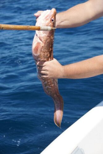 Рыба длиной максимум в полтора метра имеет розовый цвет кожицы с беловатыми полосками. У крупных особей имеется достаточный слой слизи, который порой трудно смывать. Он необходим для того, чтобы рыба могла с легкостью протиснуться между камней на дне океана, где привычно питается беспозвоночными и мелкими рыбами. Чаще всего на прилавок рыбка попадает уже замороженной без головы или в виде готового порционного филе. Брюшко более светлое по сравнению со спинкой.