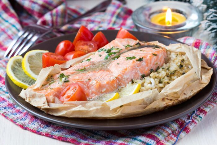 - Сформировать из пергамента лодочки, выложить туда рис и сверху уложить рыбу с лимоном;