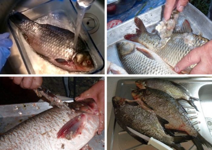 - Очищаем от чешуи рыбочисткой, потрошим, а потом снова промываем проточной водой.