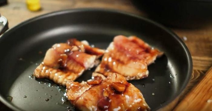 - Обжариваем их только с одной стороны, пока не появится корочка, как показано на фото. Переворачиваем, смазываем подготовленным маринадом. Выкладываем измельченный чеснок и имбирь сверху.