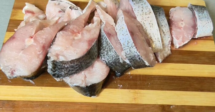 - Разрежьте рыбу на кусочки по 2 см.