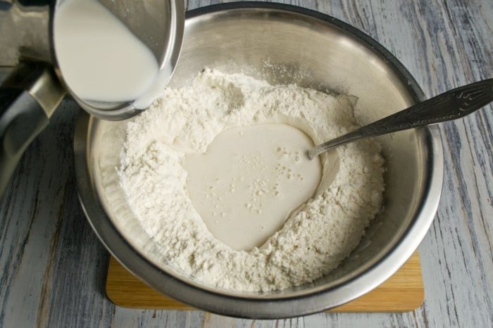 Просеянную муку ввести в яично-молочную смесь, подождать, когда она поднимется.