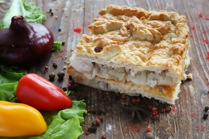 - На тесто слоями выкладывать начинку в такой последовательности: пюре, половина лука, рыба в кусочках, лук резаный. Присыпать солью, перцем черным (молотым).