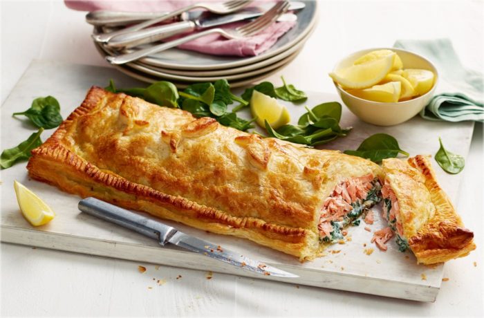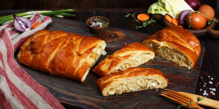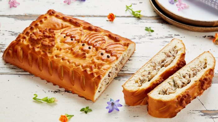 - Выбрать способ украшения. Оформить выпечку из рыбы можно лепестками, крендельками, косичками, как на фото.