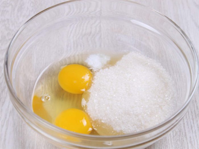 - Взбить 2 яйца венчиком или миксером. Одну ст. ложку взбитых яиц оставить в миске.