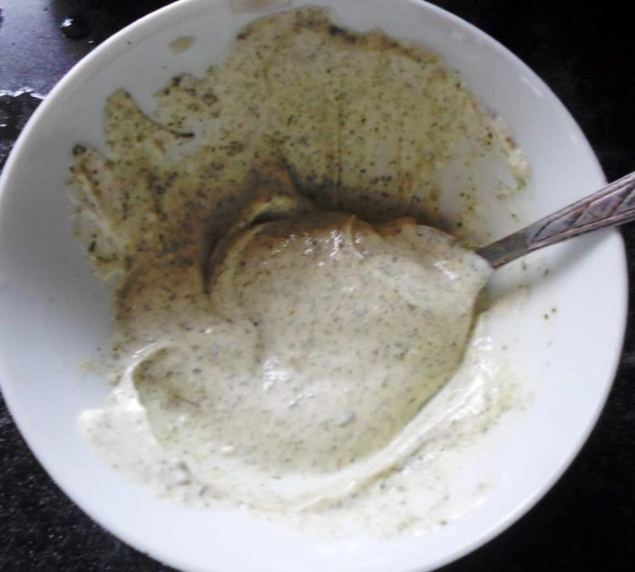 В тарелке, отдельно, смешать майонез со специями и сухими приправами.