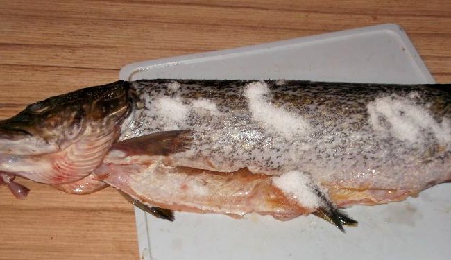 - На противень, покрытый фольгой, выложить одну часть соляной массы, размером больше чем сама щука, сверху положить тушку, и покрыть, не оставляя пробелов над рыбой, остатками соляной шубы, завернуть, и поставить в разогретую до 200 градусов духовку, минут на 40 запекаться. После достать, развернуть, очистить от соляной шубы и шкуры, порезать на кусочки, подавать к столу горячей!