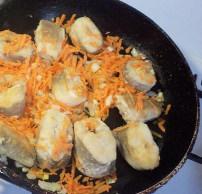 - Обжарить овощи на растительном масле. Когда они дойдут до полуготовности, необходимо на них сверху выложить кусочки рыбы. Можно слегка перемешать, но так, чтобы не повредить целостность филе.