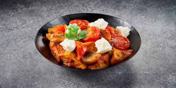 - На отдельной сковороде разогреть вторую половину постного жира и обжарить нарубленную мелко луковку. Пока доводится лук до готовности, нужно обдать кипятком помидоры и снять с них шкурку. Мякоть нарубить мелкими кубиками – добавить к луку и продолжать тушение маринада.