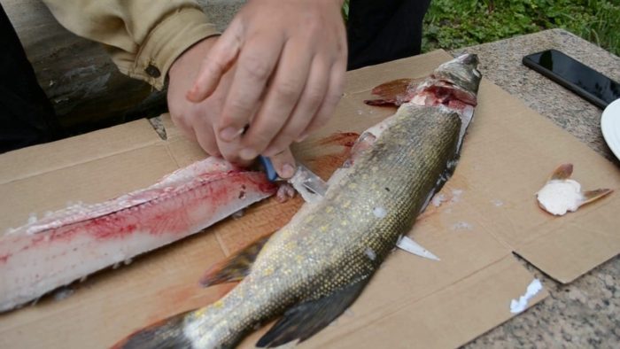 - Рыбу очищаем от костей, удаляем ненужные части: голову, хвост, плавники и внутренности. Ножом срезаем рыбное филе и шинкуем на мелкие кусочки.