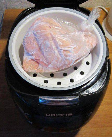 Рыбину надо поместить на решётку мультиварки или в пароварку. Установить кастрюлю на минимальный режим. В процессе оттаивания рекомендуется несколько раз перевернуть тушку. Когда она оттает, можно переключить прибор в режим жарки, варки или тушения.