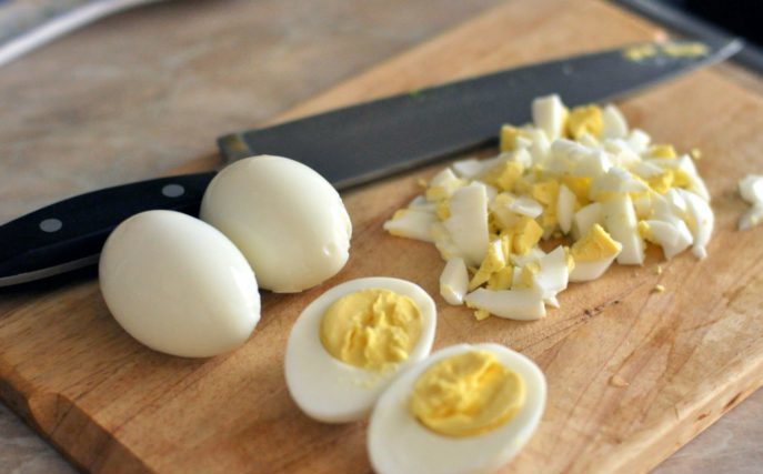 - Отварить куриные яйца, очистить их от шелухи и натереть на крупной терке.