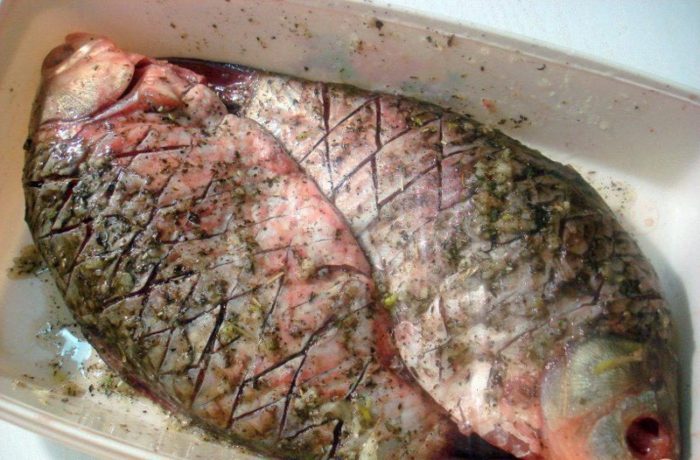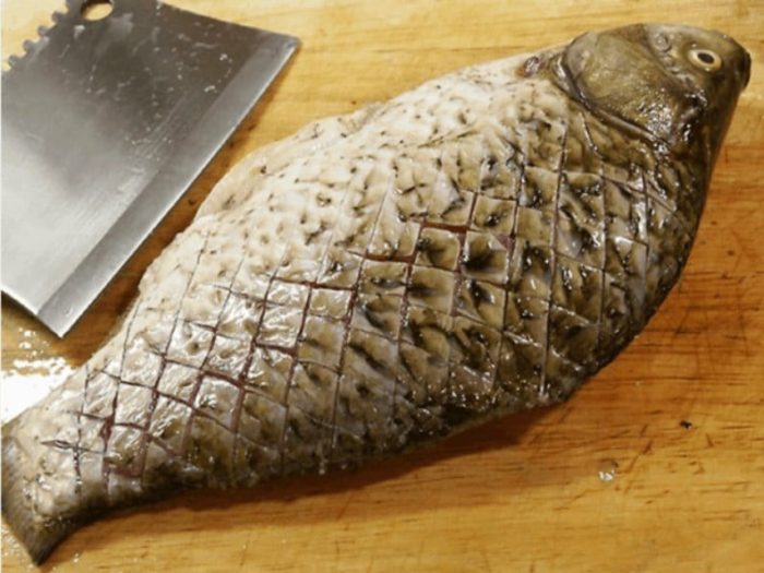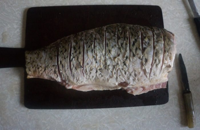 - Разделайте сазана, удалив хвост, голову и внутренности.