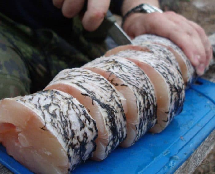 Вначале отчистить рыбу от чешуи, если это ещё не было сделано, после чего порезать на широкие куски. После эти куски разрезать пополам.