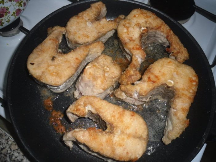 После того, как все приготовления будут закончены, можно начинать жарить. Для этого сначала кусочки щуки обвалять в смеси из муки и специй, после чего положить на сковороду. Осталось только пожарить на сильном огне. Крышкой накрывать не надо. -