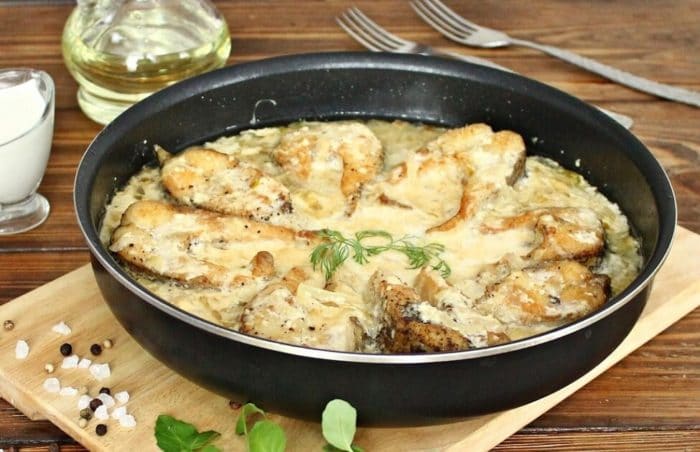 - Когда щука промаринуется – её нужно обжарить на отдельной сковородке. Когда щука пожарится с обеих сторон, к ней можно добавить поджаренный лук. Затем всё залить сметанной. Она должна покрыть всю рыбу. Когда сметана закипит нужно убавить огонь до минимума и накрыть сковороду крышкой. В таком состоянии тушить её в течение 15 минут.