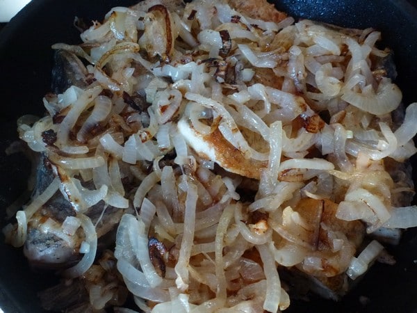 - Пора начинать готовку. Сначала нарезать лук колечками и пожарить на сковородке. После подготовить рыбу: убрать чешую, отрезать голову, вытащить внутренности и порезать на кусочки по 6-8 сантиметров. Затем эти куски замариновать в перце и соли и отложить на один час. После этого выложить к луку на сковородку.