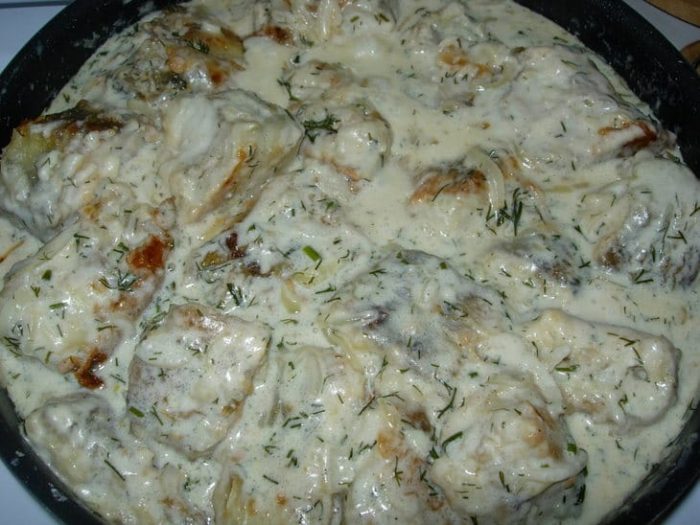 - Выложить кусочки рыбы, и все залить сметаной. В это время духовку уже следует разогревать до 180 градусов.