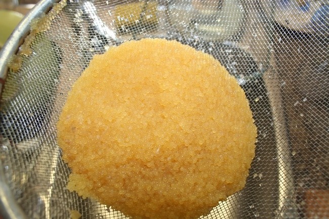 - Возьмите тару из стекла, поставив на нее сито или дуршлаг с ячейками в полтора – два миллиметра