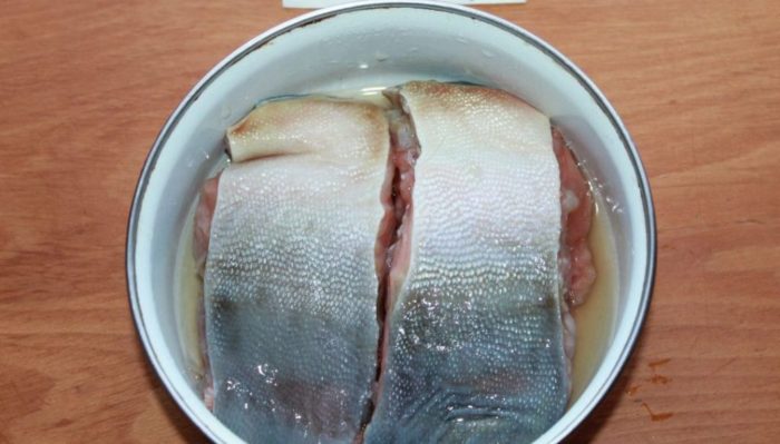 - Если рыба слишком крупная, то необходимо разделить тушку поперек на 2 части.