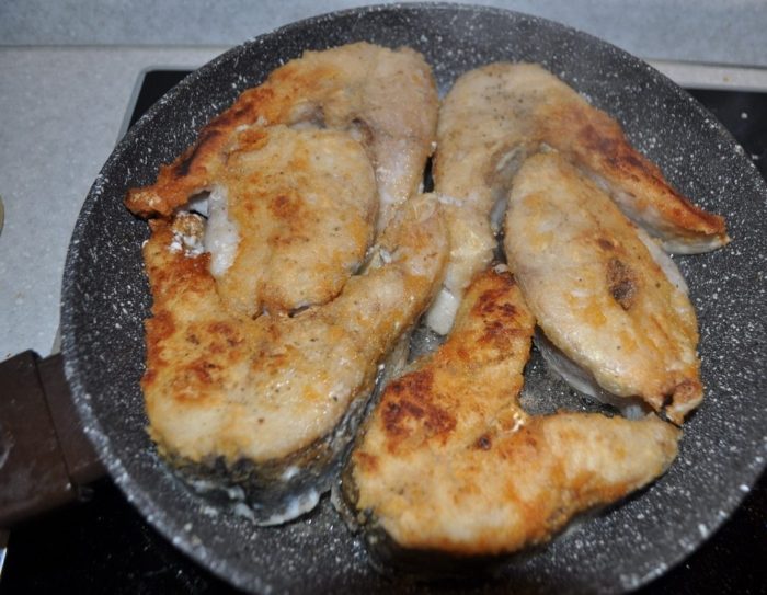- Каждый кусочек рыбы окунаем в муку и обжариваем на большом огне по 3 минуты с каждой стороны.