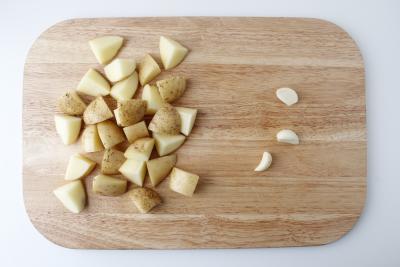 Чеснок очистите от кожуры. Картофель промойте и нарежьте на дольки. Если картофель молодой и шкурка тонкая, то снимать ее не нужно.