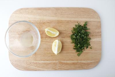 Лимон разрежьте на четвертинки. Из двух долек выжмите сок в миску. Также мелко нарежьте петрушку вместе со стеблями.
