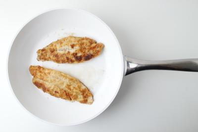 Разогрейте большую антипригарную сковороду с растительным маслом. Выложите филе судака в панировке и жарьте 3-4 минуты на сильном огне с каждой стороны.