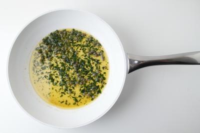 Вытрите сковороду и верните на средний огонь. Добавьте 30 г сливочного масла. Прогрейте масло около минуты, пока оно не растает. Затем снимите сковороду с огня, добавьте в масло лимонный сок, каперсы и петрушку. Аккуратно размешайте.