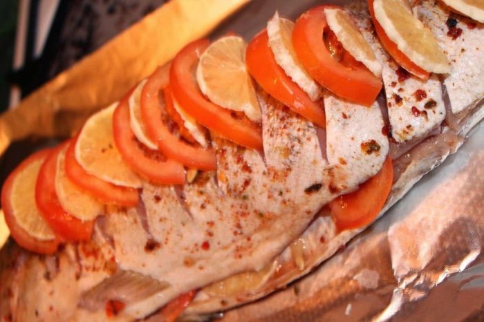 Смазывают фольгу маслом, выкладывают рыбу, в разрезы помещают лимон и помидор. Слегка подсаливают.