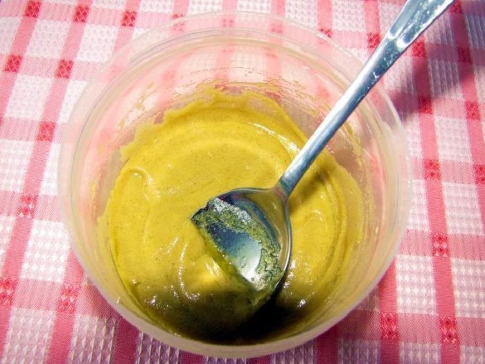 Выжимают сок из второй половинки лимона, добавляют горчицу, перемешивают.