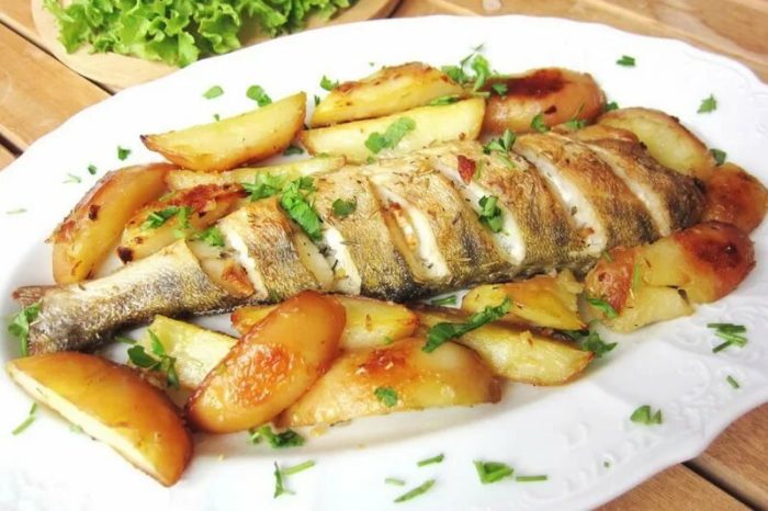 - Почистить молодой картофель, нарезать кружками, разложить поверх судака, посолить.