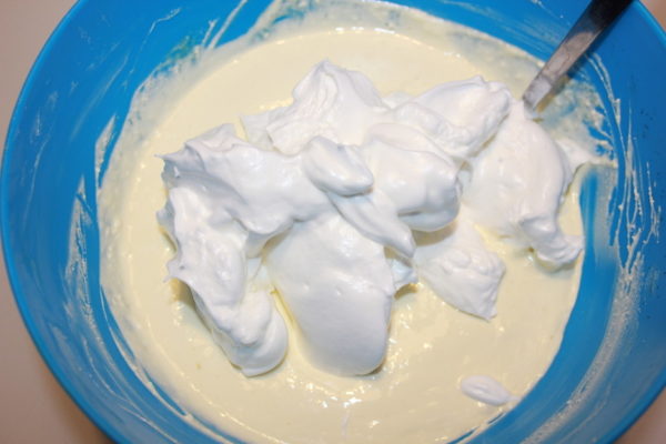 - Небольшими порциями вводим сметану, вливаем молоко комнатной температуры и снова тщательно перемешиваем ингредиенты.