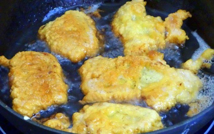 - Вынимаем замаринованные прямоугольники из прохладного места. Обмакиваем каждый ломтик в кляре, затем сразу помещаем его на сковороду с предварительно разогретым растительным жиром. Его нужно брать в достаточном количестве – оно должно полностью покрывать рыбные ломтики.