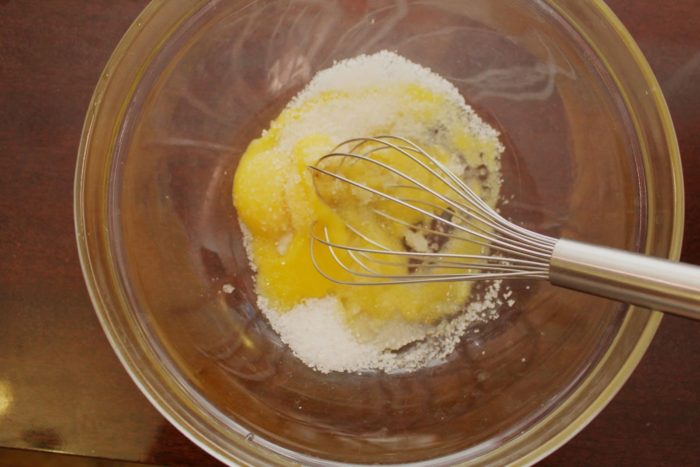 В отдельную ёмкость разбиваем два куриных яйца, добавляем 0,5 ч.л. сахара. При помощи венчика или блендера тщательно взбиваем смесь.