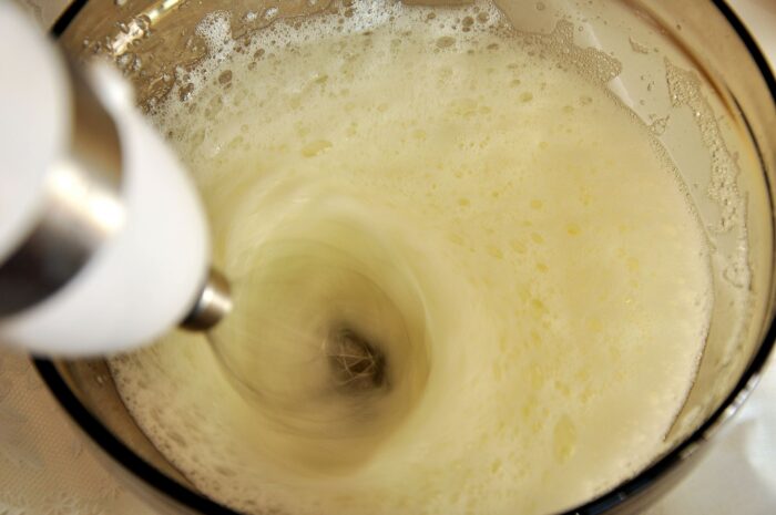 - Чтобы взбить белок, нужно добавить щепотку соли, взбивать необходимо в отдельной посуде. Когда получится густая пена, ее необходимо выложить к остальным ингредиентам, взбить повторно.
