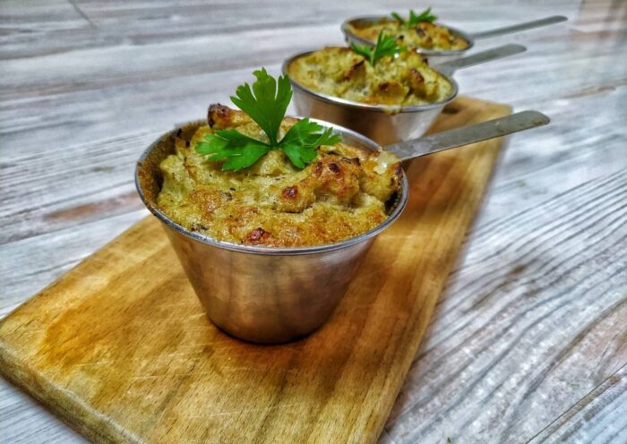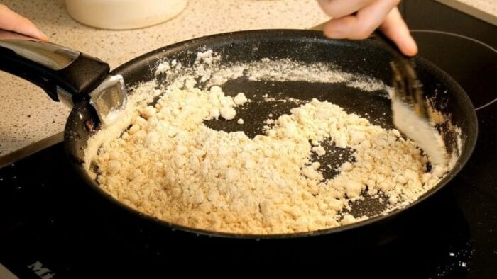 На сухой сковороде необходимо пожарить муку до золотистого цвета. Когда она приобретет нужный цвет, надо добавить молоко, тщательно перемешивая продолжать жарить. Консистенция должна напоминать манную кашу или пюре. После того, как соус будет готов, нужно процедить его через сито. Это необходимо для того, чтобы предотвратить образование комочков. Далее соус надо оставить настаиваться и остывать.