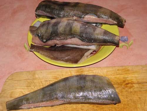 - Терпуга промыть, очистить от чешуи, отрезать голову и выпотрошить.