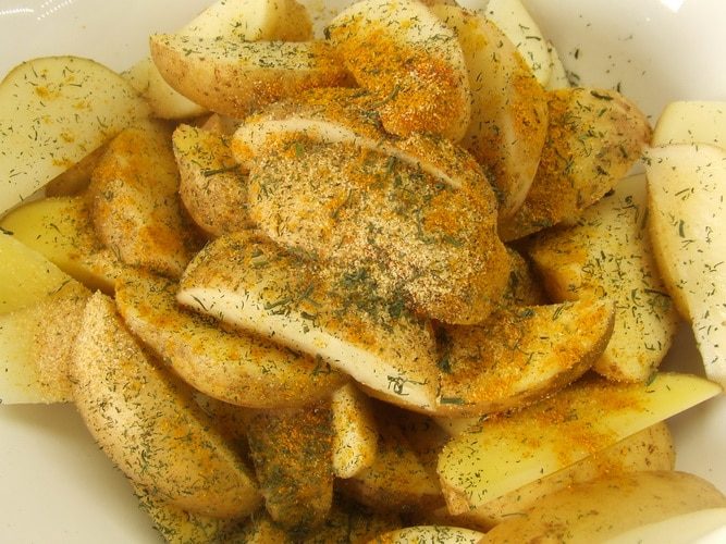 Сверху посыпать картофель солью, перцем, чесноком и куркумой. Тщательно перемешать.