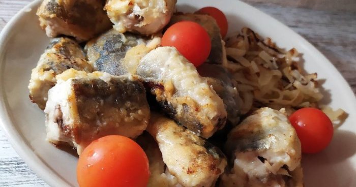 - Рыбу помыть, очистить от чешуи, отрезать голову, плавники и хвост. Тушку нарезать на небольшие кусочки шириной 2-3 см. Натереть их солью, побрызгать сверху соком лимона.