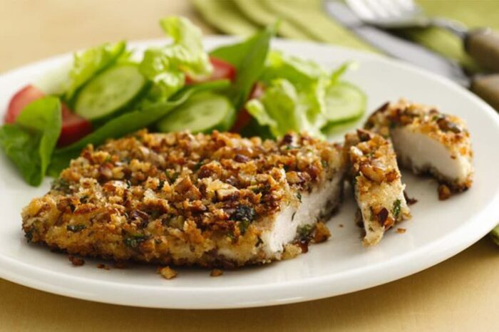 - Возьмите филе. Обсыпьте мукой. Положите его в смесь молока с яйцом. Далее рыба панируется в орехах, обжаривается по две минуты с каждой стороны.