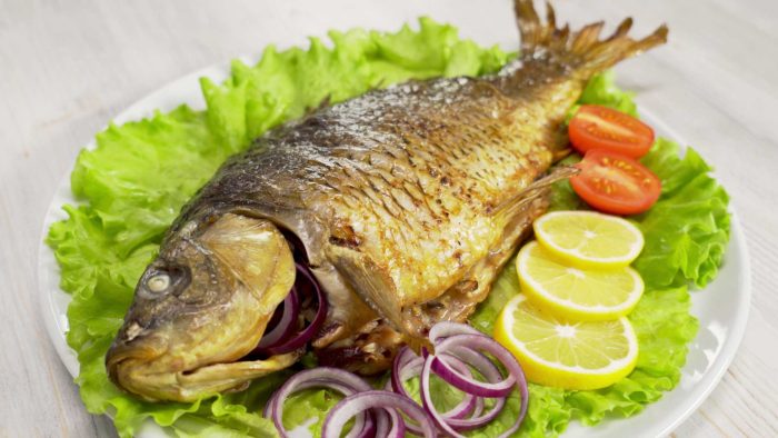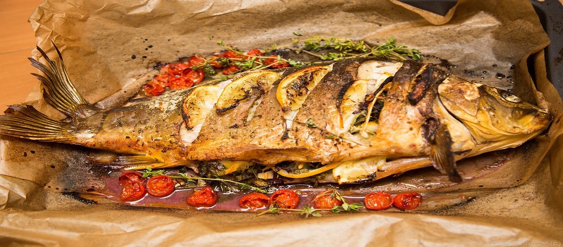 Традиционное блюдо – это карп, нафаршированный гречневой крупой. Запекается он в духовом шкафу, но для того, чтобы начинка осталась сочной, лучше использовать рукав для запекания.