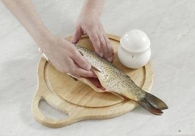 - Карпа выпотрошить, вымыть и разрезать на порционные куски. Постараться вытащить мелкие и крупные косточки.