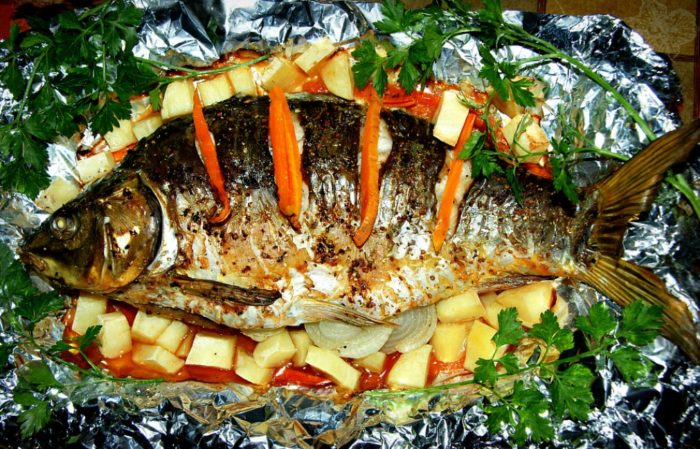 Можно приготовить карпа в фольге с картофелем. В этом случае получается самостоятельное блюдо, которое сможет стать полноценным обедом или ужином.
