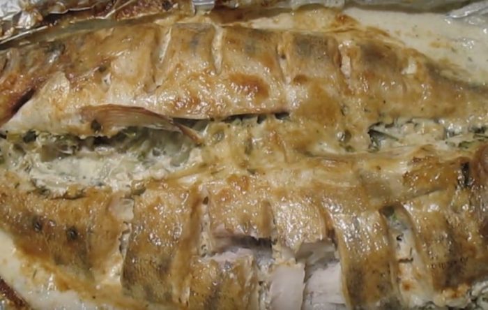 - Заворачиваете фольгу и отправляете готовиться в разогретую до 200 градусов духовку на полчаса. После этого фольгу надо развернуть и отправить рыбку в духовку ещё на несколько минут, для того чтобы она зарумянилась.
