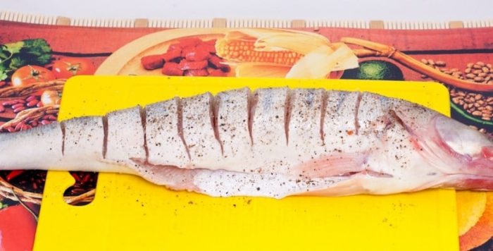 - Рыбу почистите, удалите голову, хвост и плавники; рыбу выпотрошите, затем хорошенько вымойте и обсушите. По всей тушке сделать неглубокие надрезы. Затем натереть солью и перцем, а также обмазать растительным маслом.